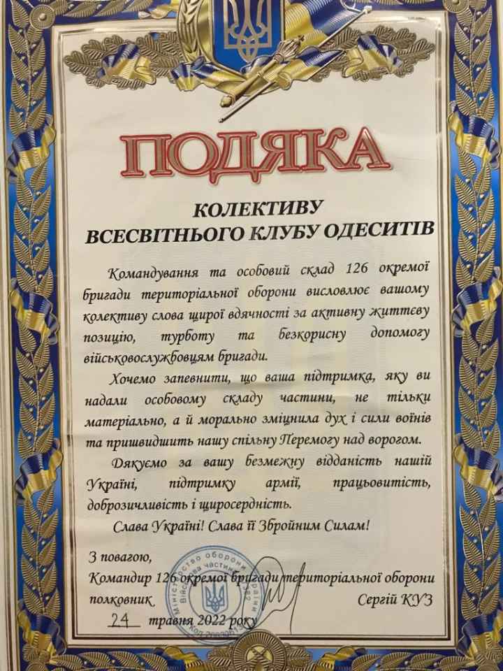 В это очень не простое время, в которое Клуб, как и каждый из нас, вносит свой вклад в победу нашей Украины над агрессором, мир в своем городе, ВКО было организовано и проведено около 200 благотворительных мероприятий, большинство из которых были направлены на моральную поддержку одесситов и временно перемещенных в Одессу людей.