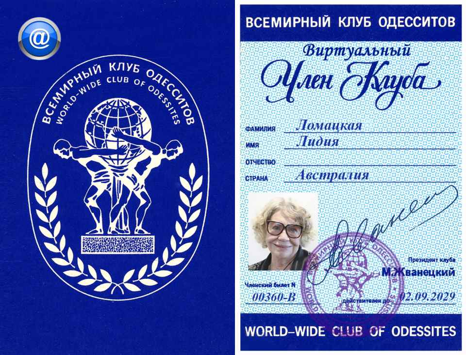 Прошу принять меня в члены Всемирного Клуба Одесситов так как я очень люблю Одессу, родилась в Одессе и ощущаю себя одесситкой несмотря на то, что уже много лет живу в Австралии. С Одессой у меня связаны лучшие воспоминания. Там я окончила школу, поступила в театральное училище (правда, мне не удалось его окончить по независящей от меня причине), вся моя дальнейшая рабочая жизнь была связана с одесской железной дорогой. Много лет я проработала секретарем начальника станции Одесса-Порт, а затем администратором Железнодорожного санатория-профилактория, вплоть до отъезда в Австралию. Больше десяти лет пела в хоровой капелле в одесском Клубе Железнодорожников До сих пор поддерживаю связь с Одессой - родственниками и друзьями. Для меня большая честь быть признанной виртуальным членом Всемирного Клуба Одесситов, спасибо большое всем членам Клуба и лично Гари Волку.