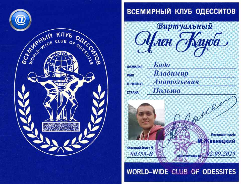 Добрый времени суток уважаемый, представитель Всемироного клуба Одесситов, который ответственный за чтение писем из данного почтового ящика. Надеюсь у Вас хорошее настроение и я не очень потревожил Вас, если Вам не сложно уделите пару минут Вашего времени на прочтение данного письма, спасибо. Пишу Вам находясь в старом районе города Краков, именуемым Казимеж, рядом с одним заведением обнаружил весьма знакомый и всегда любимый образ прекрасного города Одессы, а именно старую карту Одессы (знаете, как в песне: - "я узнаю её из тысячи..."): ну и преисполненный самыми прекрасными, яркими и теплыми чувствами, когда находиш в месте где ничего такого быть не может, кусочек родного и любимого города, ностальчические нотки заставили меня окунутся во всемирную паутину, где я и нашел Всемирный клуб одесситов. Как Одессит я был обязан Вам написать, да и очень интересно стать членом Всемирного клуба одесситов, хоть и виртуальным. Фамилия: Бадо Имя: Владимир Отчество: Анатольевич города проживания: Краков (Польша) Жду Вашего ответа, Желаю Вам хорошего дня и улыбнитесь, Вы живете в самом прекрасном городе в мире! С Уважением, Бадо Владимир.