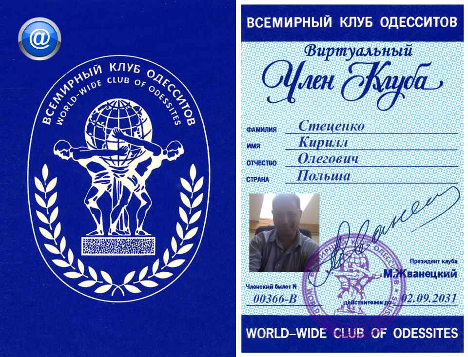 Уважаемые руководители ВКО, пишу с просьбой принять меня в ВИРТУАЛЬНЫЕ ЧЛЕНЫ ВСЕМИРНОГО КЛУБА ОДЕССИТОВ. Покинув Одессу молодым человеком, в течение последних 111 07 213 лет я менял города и страны проживания, виды деятельности и имена. Благодаря этому сейчас я как никогда остро и отчетливо чувствую, что единственной опорной и незыблемой самоидентификацией в моей жизни остается идентичность "Я одессит". Живя заграницей в полуизоляции, остро нуждаюсь в подпитке витаминами родного города и энергией созвучных мне людей. Именно поэтому несказанно благодарен вам за создание и развитие ВИРТУАЛЬНОЙ ОДЕССЫ. Буду еще более признателен за официальную прописку в ней. О себе могу сообщить следующие данные. СТЕЦЕНКО КИРИЛЛ ОЛЕГОВИЧ Одессит украинско-армянско-молдавско-кубанского происхождения. Проживаю в г.Краков (Польша). Из вещественных доказательств своей одесскости (надеюсь, достаточно вещественных для виртуального членства) могу предоставить два: 1. Список выпускников Ришельевского Лицея 2001 года (см. Отделение Математики) 2. Мое исполнение "Песни об Одессе". Сделано совместно со львовским виртуозом Олегом Яремой в мой львовский период жизни. В этом исполнении кристаллизованы все мои сентименты к родному городу. С нетерпением жду узнать, каким будет ваш положительный ответ! С уважением, Кирилл Стеценко