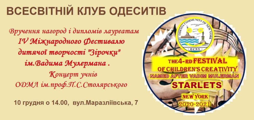 Вручення нагород і дипломів лауреатам IV Міжнародного Фестивалю дитячої творчості "Зірочки" імені Вадима Мулермана та концерт учнів Одеський Державний Музичний Ліцей ім. проф. Столярського відбувся у Всесвітньому клубі одеситів 10 грудня.