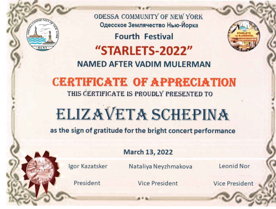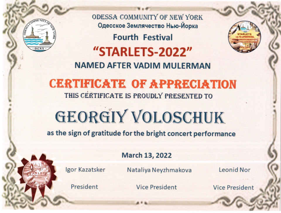 Автор ідеї та продюсер Фестивалю, Президент Одеського земляцтва в Нью-Йорку Igor Kazatsker передав до Одеси почесні нагороди: кубки, дипломи та медалі талановитим юним одеситам, а їхнім педагогам і батькам душевну подяку: