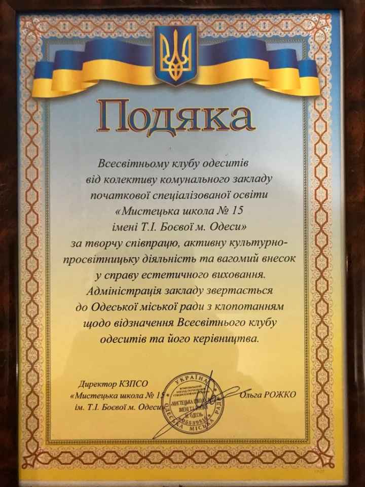 Великим сюрпризом для керівництва ВКО стала "Подяка" від колективу КЗ Початкової спеціалізованої освіти "Мистецька школа № 15" імені Т.Бойової м. Одеси. Адміністрація школи звертається до Одеської міської ради з проханням відзначити Всесвітній клуб одеситів і його керівника за творчу спвпрацю, активну культурно-просвітницьку діяльність та вагомий внесок у справу естетичного виховання.