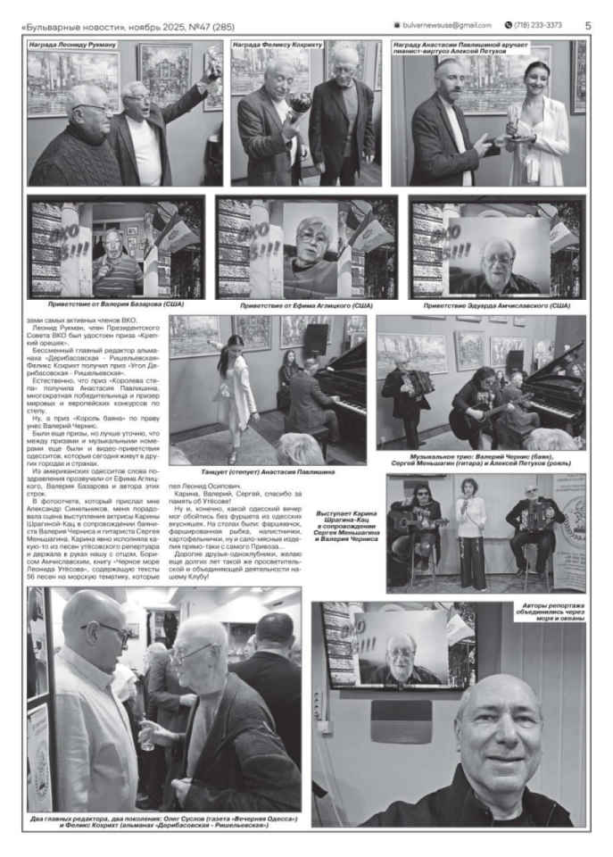 27 листопада 2025. Про ювілей ВКО у газеті «Бульварные новости» Про ювілей ВКО дізналися в Нью-Йорку. Закордонний член Клубу та наш давній друг Едуард Амчиславський опублікував у газеті «Бульварные новости» великий матеріал і фоторепортаж Олександра Синельникова про свято, що відбулося. 0