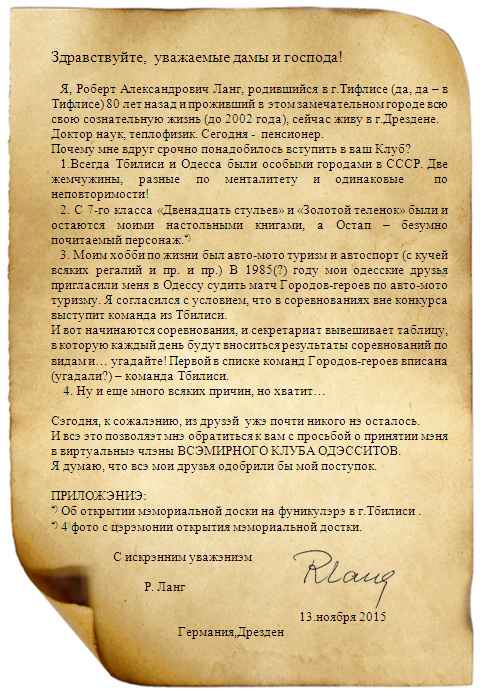 Хочу, чтобы мы все стали дружными и, при необходимости, всегда приходили на помощь друг другу. Ещё планирую наладить переписку с Клубом Одесситов в Берлине.