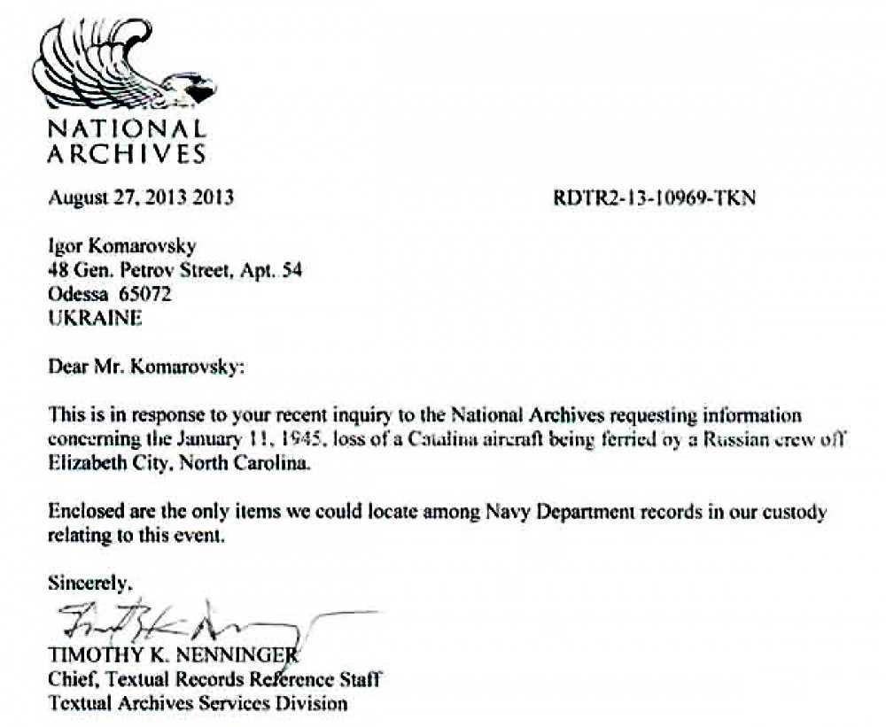 Потім 19 березня 2013 р. було звернення у бібліотеку університету Фербенкса. Вже 20 березня була отримана відповідь такого змісту: «Прочитали запит з великим інтересом, проте потрібних відомостей не виявили». Порадили звернутися в Національний архів США, відповідь з якого свідчила: «Оскільки невідомий номер літака, дата і місце падіння, то в цьому випадку пошук неможливий».